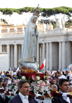 La statue n’est pas prévue pour la façade de la basilique, mais pour les ateliers de moulage Daprato Studios à Chicago. Cependant le dominicain la propose à l’évêque de Leiria comme un don des Américains pour le sanctuaire. Après avoir refusé dans un premier temps, Mgr José Da Silva accepte l’offre et souhaite que la statue soit placée au-dessus de l’entrée de la basilique.