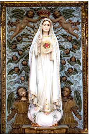 Terminons par une photo toute modeste d'une statue de Fatima montrant comment dans une église, en France, on y vénère le Cœur Immaculé de Marie et où chaque premier samedi du mois il s'y célèbre une messe chantée en son honneur.